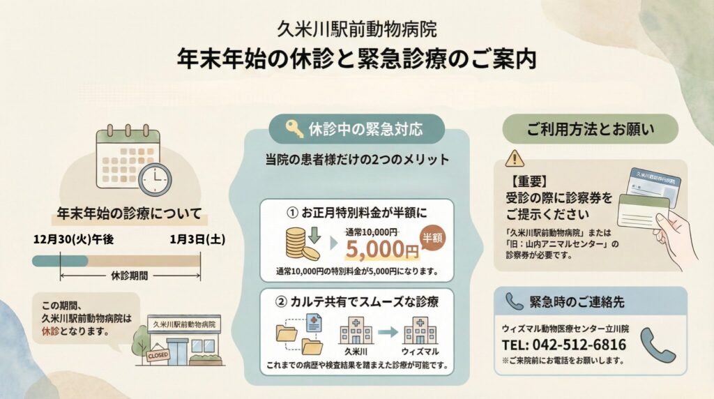 当院が休診の間、提携の「ウィズマル動物医療センター立川院」にて救急診療を受け入れております。 (期間:12月31日〜1月3日)